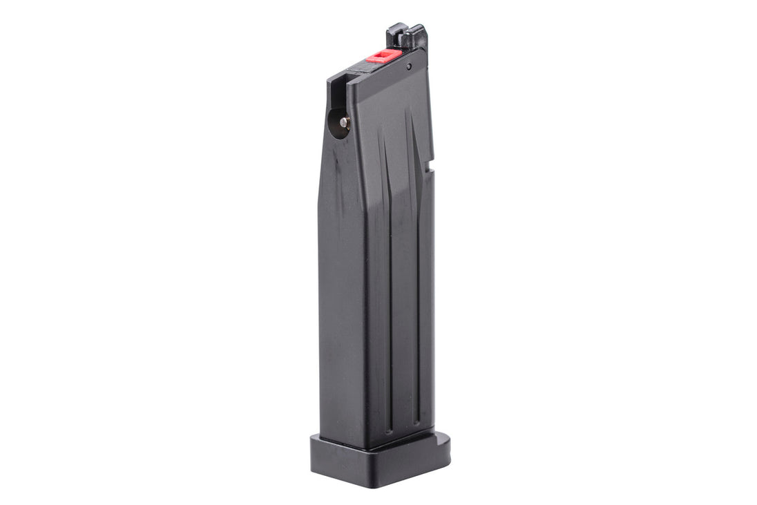 Licensed engraving with unique serial number. CNC-machined aluminum-alloy slide and metal outer barrel; metal mid-frame and metal sights. Burn-pattern nylon-fiber grip with metal base plate. Full-metal magazine and baseplate.