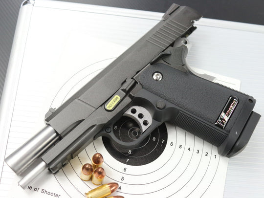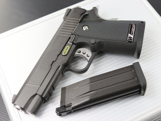 WE HI-CAPA 4.3 S 版 — 全金屬競技 6mm 瓦斯手槍 上、下槍身全金屬(握把為 ABS 塑膠)。射擊時滑套自動後退(Blowback),射擊完滑套自動後定。競技化設計,適合比賽與靶場練習。 規格 全長:200 mm 重量:約 945 g 初速:90–110 m/s 動力:瓦斯 (Gas) 裝彈數:30 發 口徑:6 mm BB Hop-Up:可調 Blowback:有 材質:全金屬(握把 ABS) 配件 主槍 ×1 說明書 ×1...原價 $1,880.00原價 $1,880.00 -