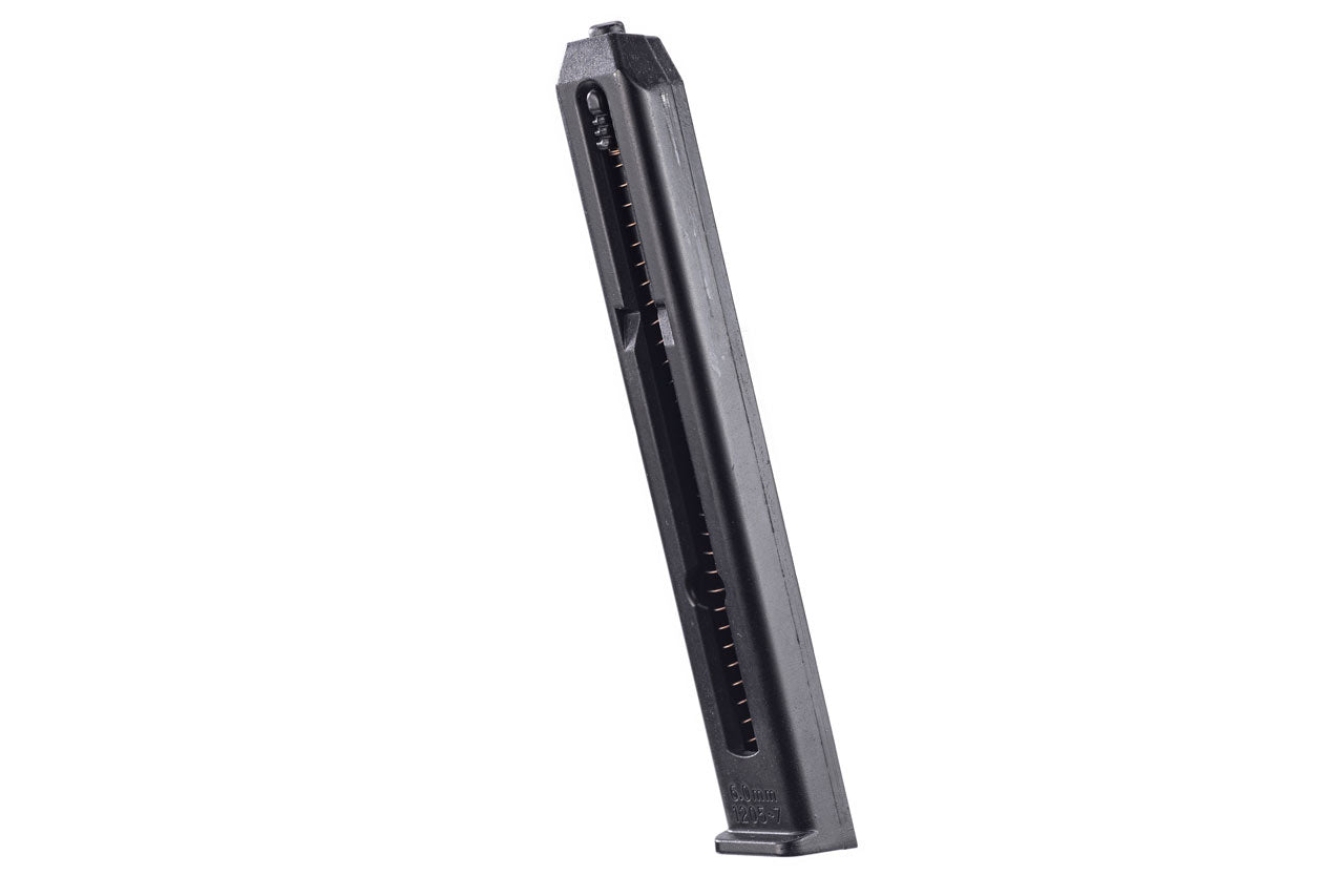 CO2氣瓶置於握把內 → 旋開握把片鎖緊氣瓶 → 裝填BB彈 → 插入彈匣 → 扣動板機即可擊發。
