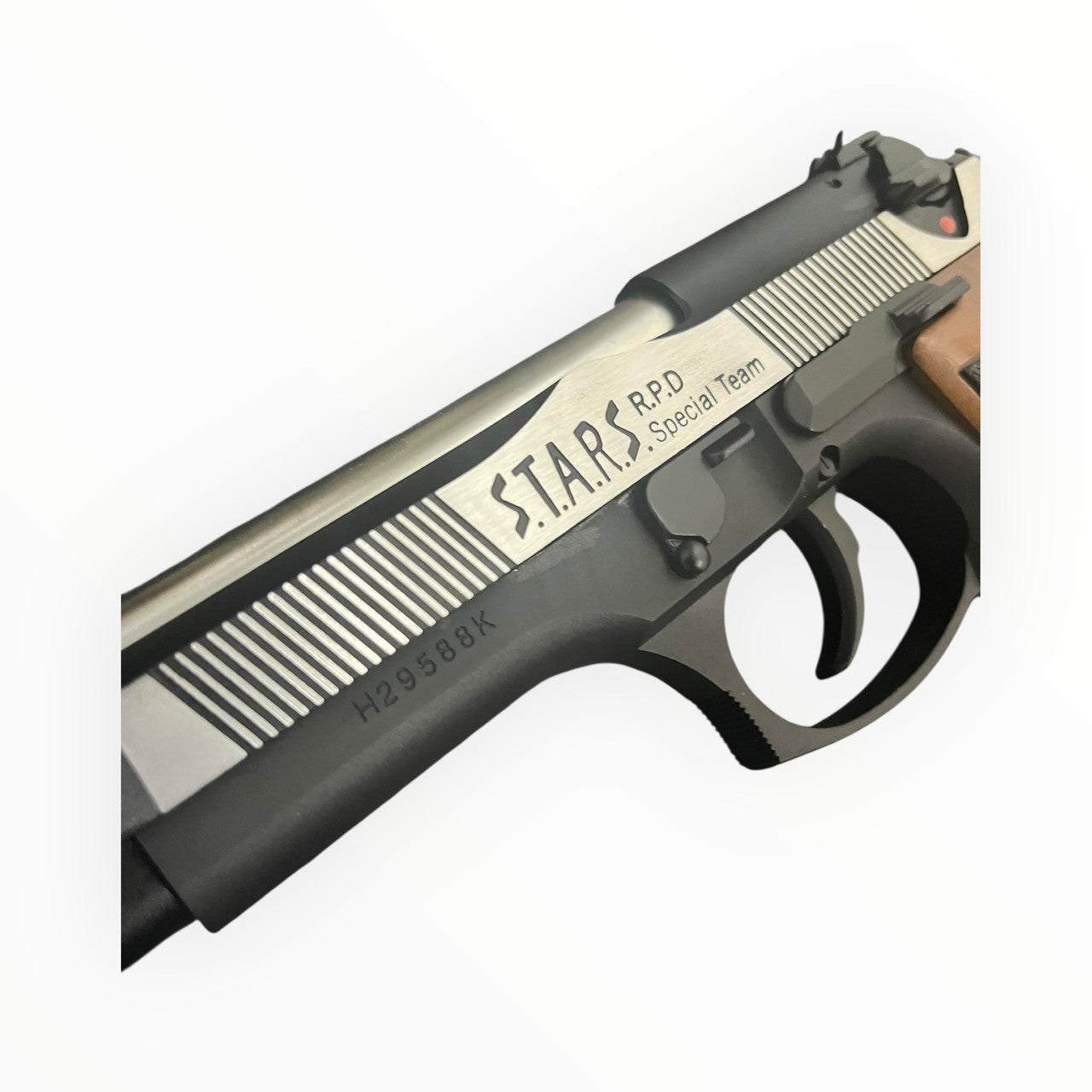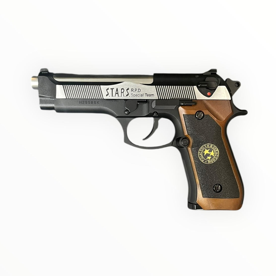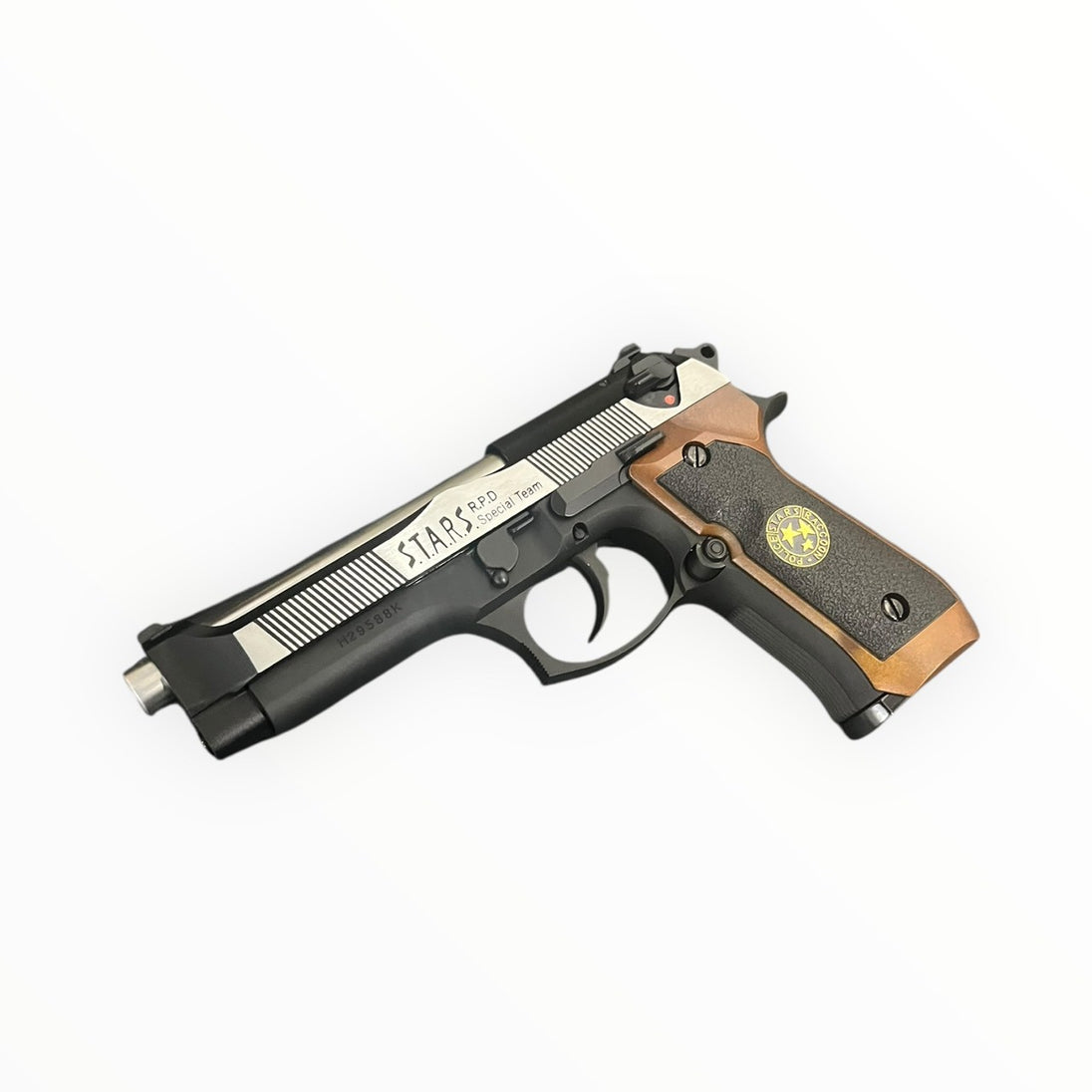 拋光外觀全金屬 WE M9,滑套可動並具覆進(Blowback)效果,射擊手感扎實。支援瓦斯動力(另有 CO₂ 版本)。適合生存遊戲、訓練或收藏。請遵守當地法規與場地規定。