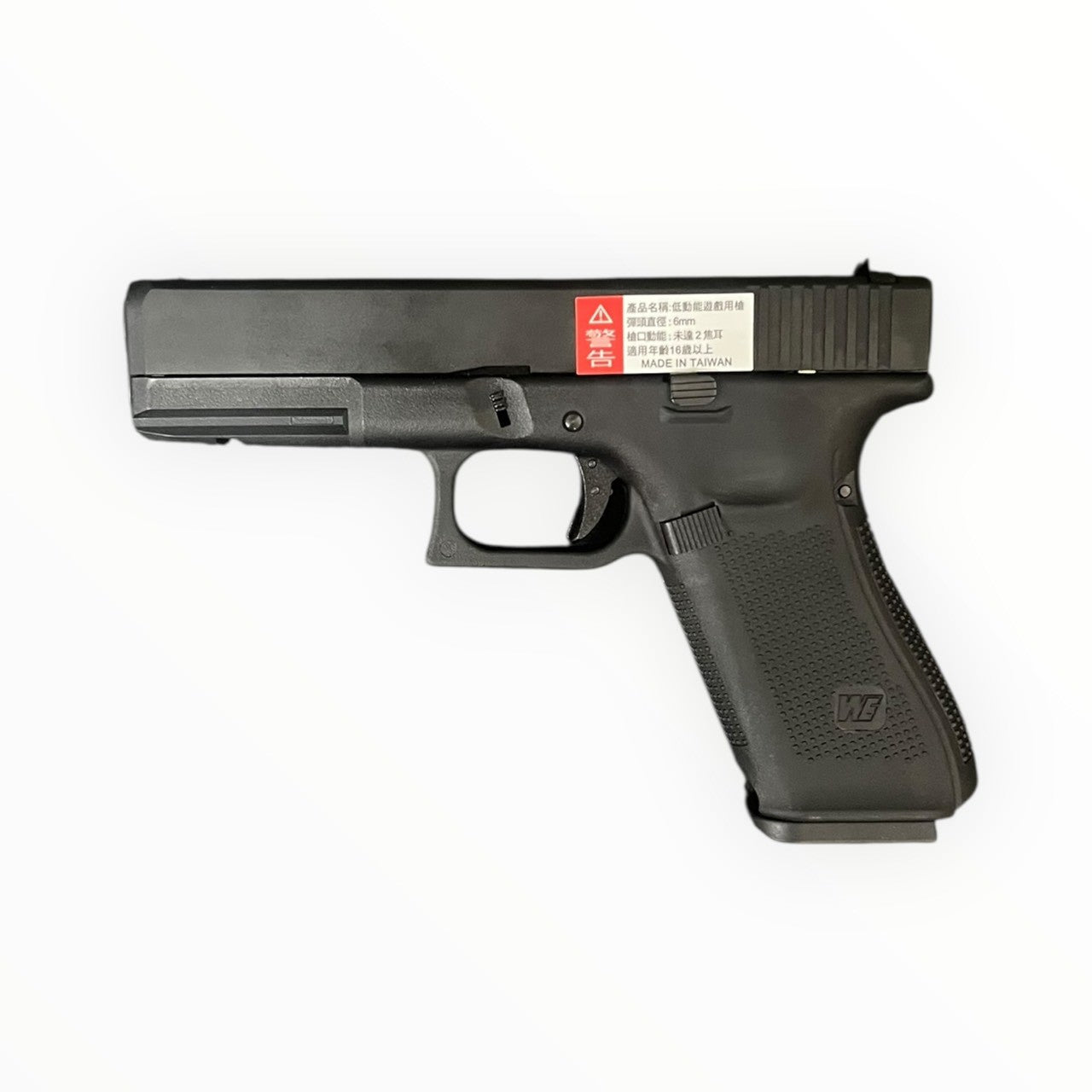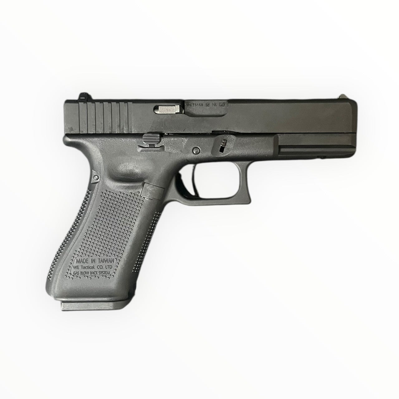 WE G17 第五代,金屬滑套與金屬外管,瓦斯驅動並具實感後座力與滑套復進。外觀耐用、操作擬真,適合生存遊戲、訓練或收藏。使用與運輸請遵守當地法規與場地規定。