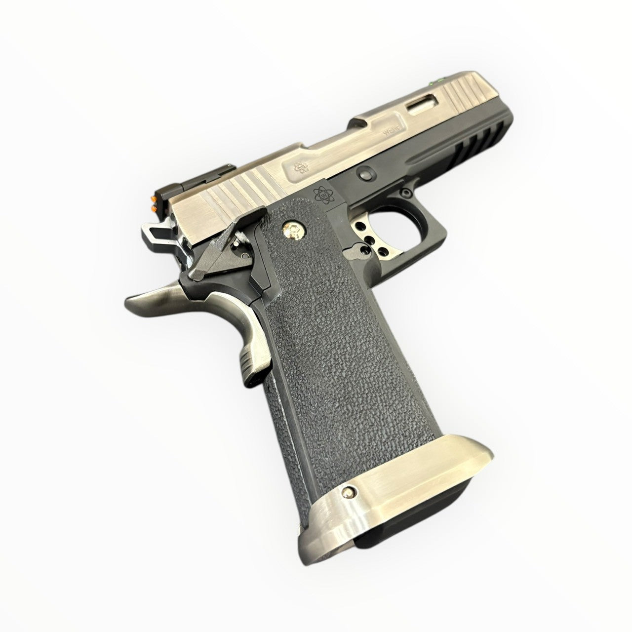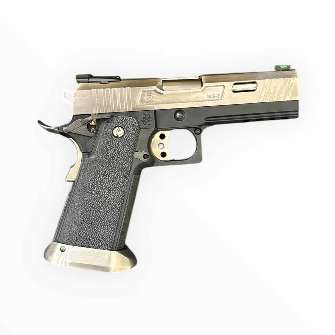 WE Hi-Capa 4.3 WET series features a metal slide with striped design and supports semi-auto and full-auto (full-auto model). Gas-powered with smooth slide cycling. Ideal for airsoft skirmishes, training, props, or collecting. Always comply with local laws and field rules.