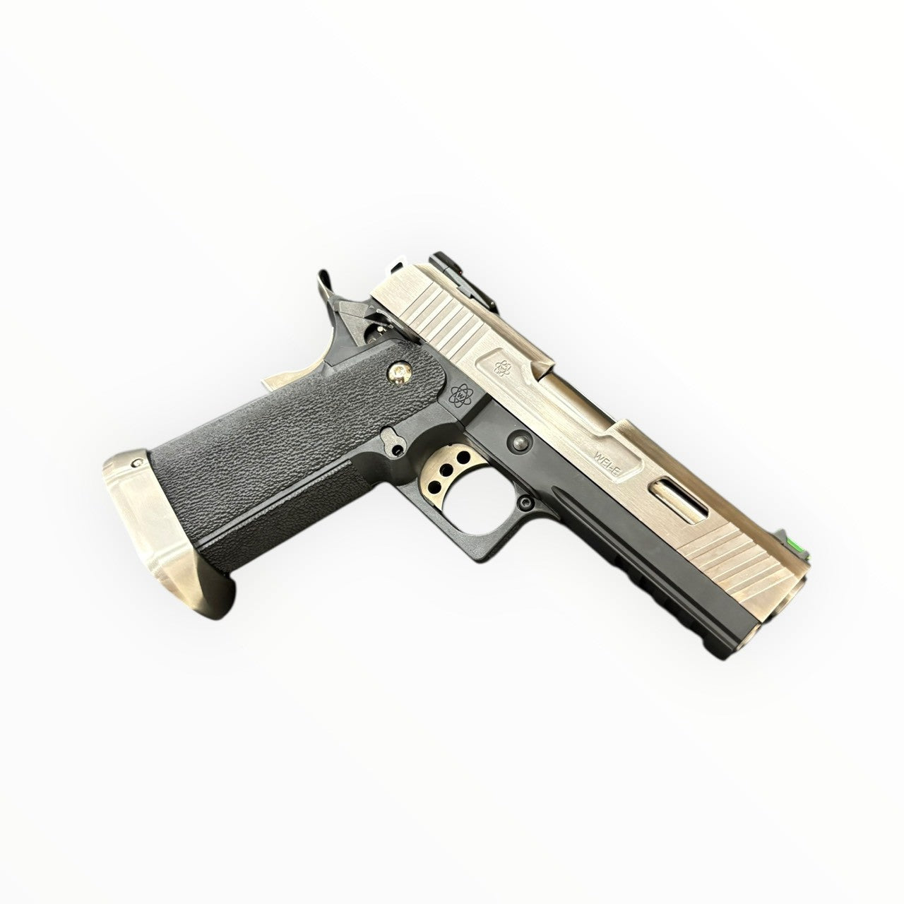WE Hi-Capa 4.3 原力系列,金屬外部結構與直紋滑套設計,支持半自動與連發模式(連發版)。瓦斯動力,滑套復進順暢。適用生存遊戲、訓練、道具或收藏。請遵守當地法規與場地規定。