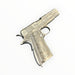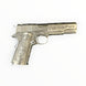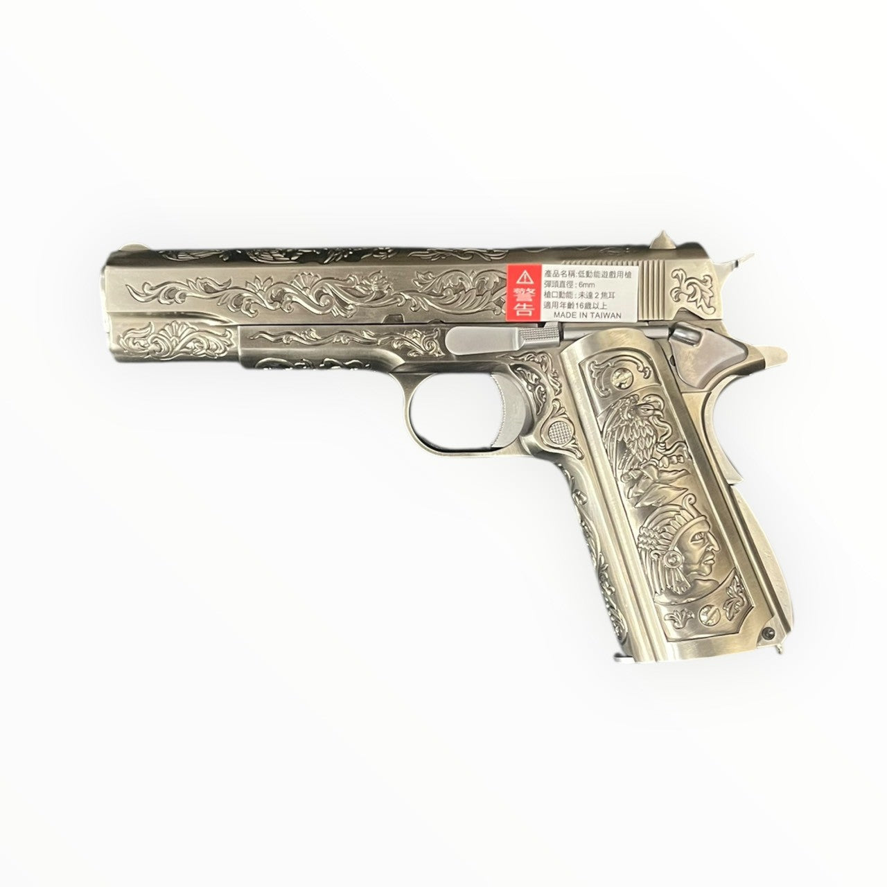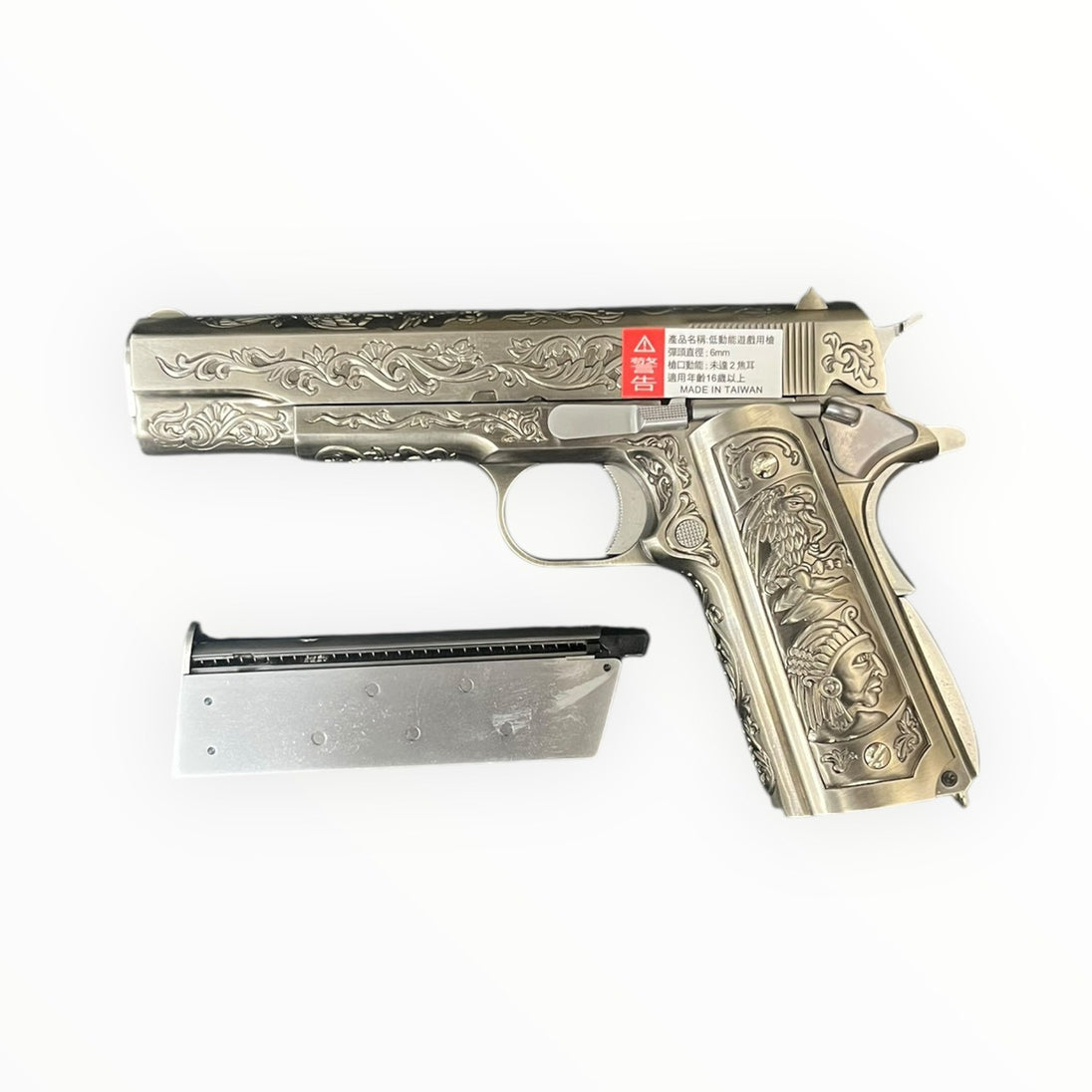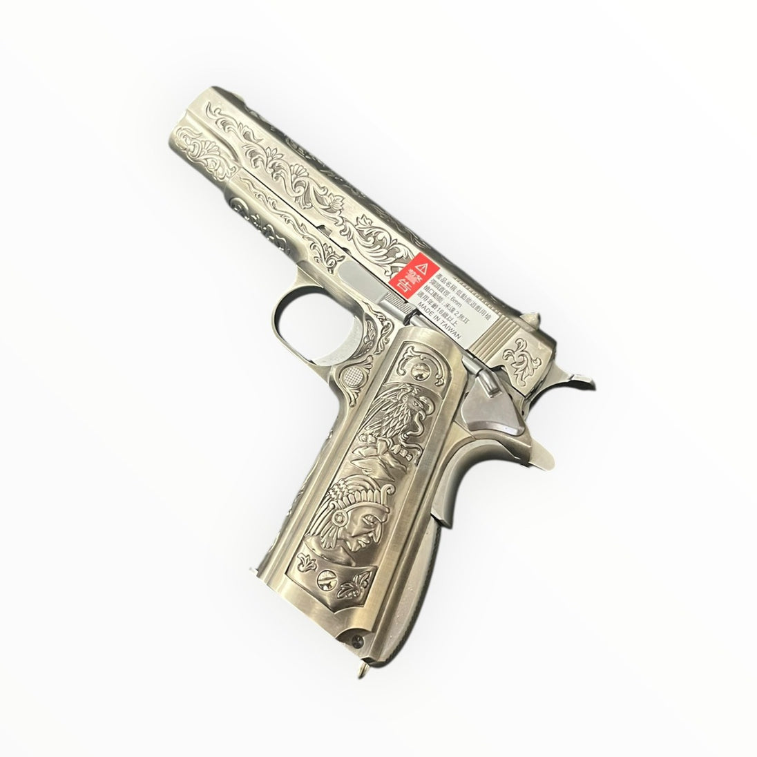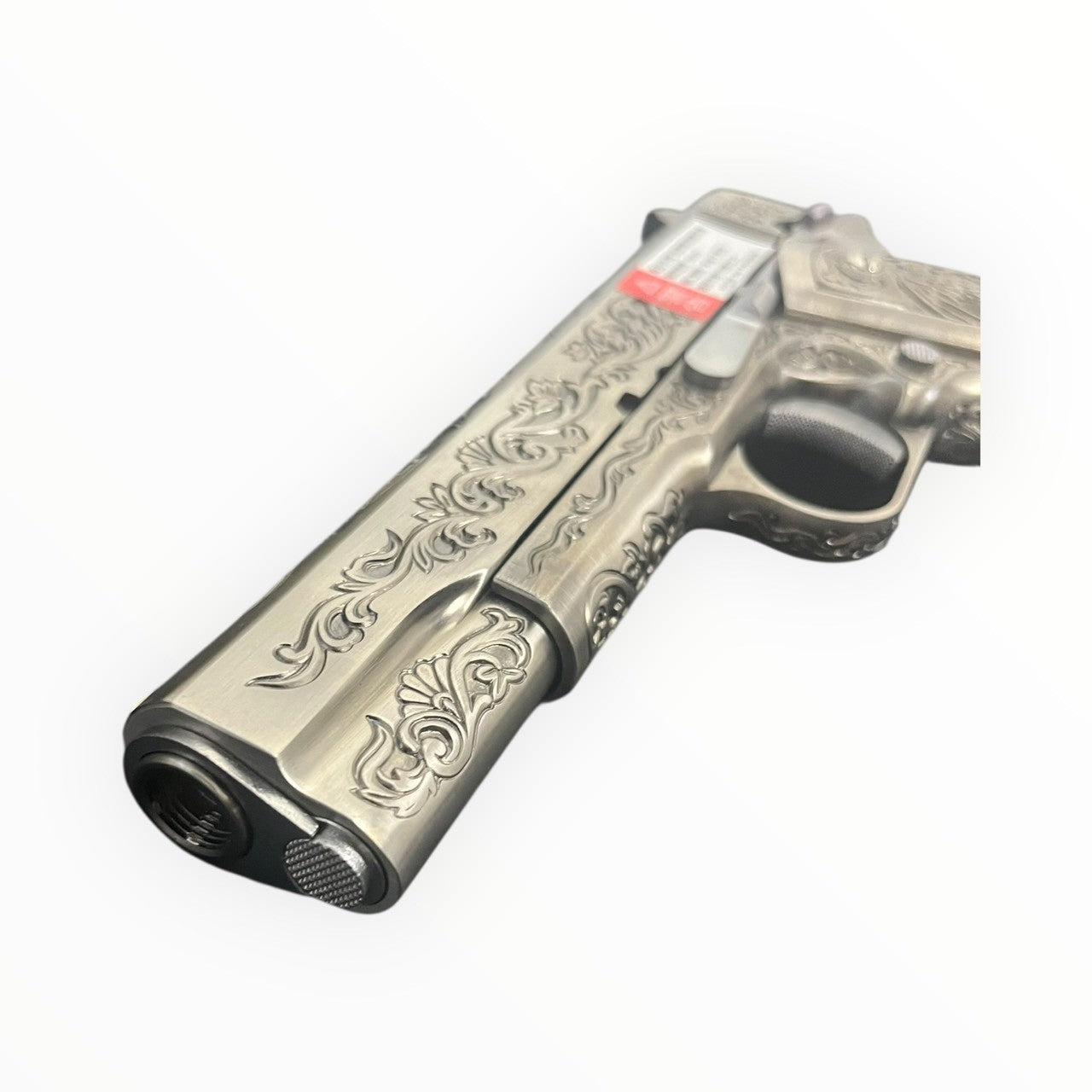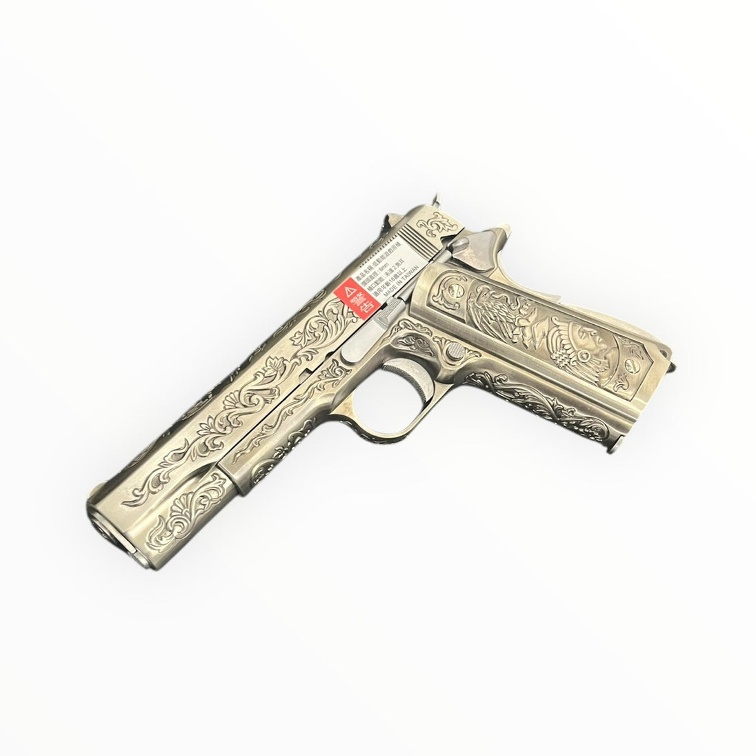 全金屬 M1911 仿真瓦斯手槍,銀色立體雕花槍身,質感出色。滑套可動並具最後一發後定,具可調 HOP,適合收藏、展示或生存遊戲。使用與運輸請遵守當地法規與場地規定。