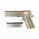 Full-metal WE M1911 gas blowback pistol with silver three-dimensional engraving for premium appearance. Moving metal slide with last-shot slide-lock and adjustable hop-up. Ideal for collecting, display, or airsoft use. Always comply with local laws and field rules.