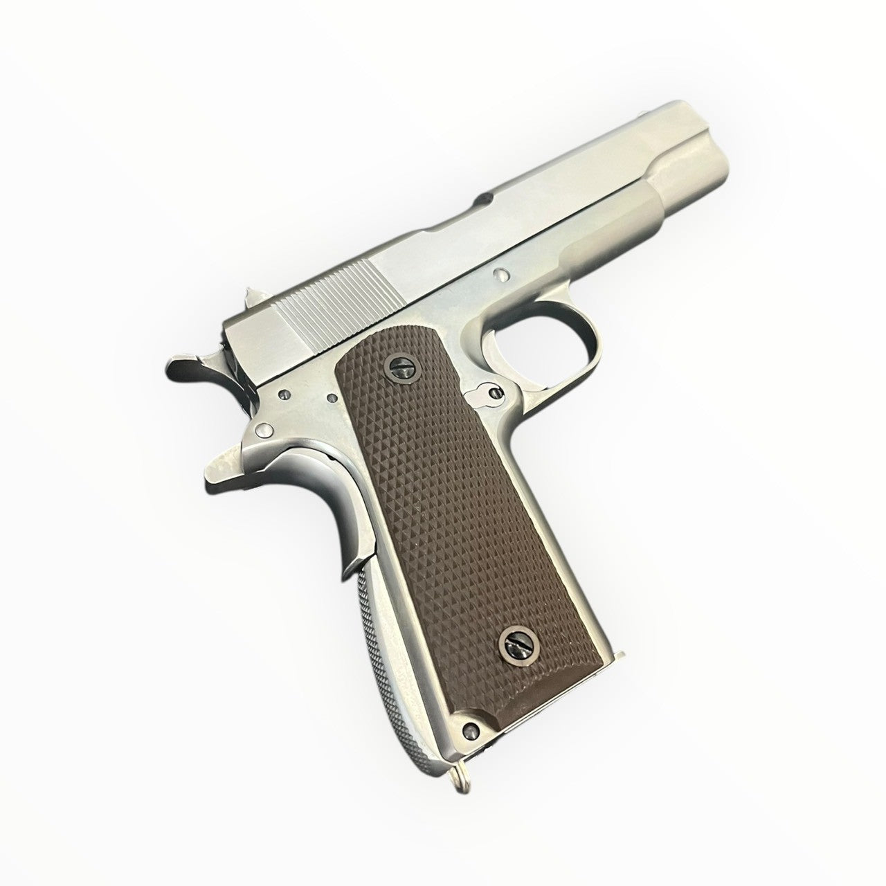 Chrome-plated aluminum slide with full-metal construction and brown grip for a premium look. Adjustable hop-up, moving slide with last-shot slide-lock, crisp report and noticeable recoil. Suitable for collecting, competition, or airsoft play. Always comply with local laws and field rules.