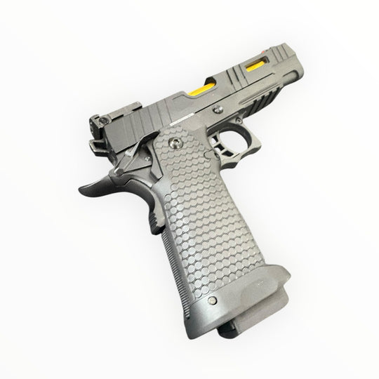 Golden Eagle金鷹HI-CAPA 5.1 3336 CNC滑套Marui規格瓦斯短槍手槍 * 同KJ WE規格 維修免煩惱* 金屬滑套、槍管、槍身前段* 高強度聚合物握把* 全CNC製成簍空鋁合金滑套,上下身公差緊密* 槍管採電鍍金色跳色處理* 不跌管設計,性能更加穩定* 握把特殊紋理處理,扳機護弓處指槽加工,提供極佳的持握手感* 內帶光纖準星* 帶有虎口保險* 帶有拇指保險(拇指保險需在擊槌為待發位置時才可開啟)* 加大握把襯裙、加大彈匣底板* 滑套射擊時自動復位,有無彈後定功能* 可兼容市面上多數HI-CAPA零配件、彈匣(Marui規格)* 下身帶20mm魚骨軌道,可安裝槍燈或雷射 ————————————————————— 產品規格 * 品牌:Golden Eagle* 原廠編號:3336* 口徑:6mm * 動力:瓦斯* 初速:90±5 m/s* 長度:222mm * 重量:646g * 裝彈數:25發 * 材質:金屬滑套、槍管、槍身前段/聚合物握把*...Prix normal $3,480.00Prix normal $3,480.00 -