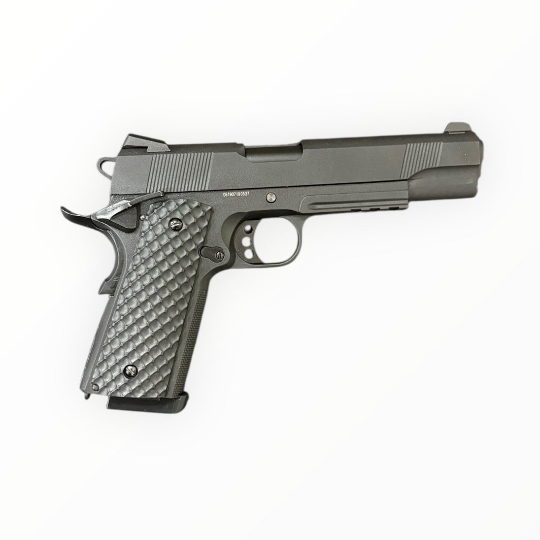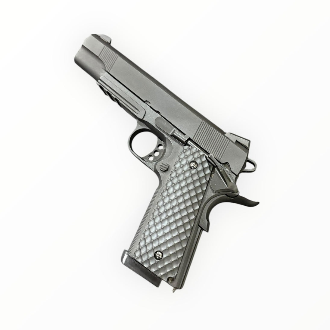 仿真 1911 短槍,輕量化鋁合金滑套與噴粉質感表面。雙系統兼容瓦斯/CO₂ 彈匣,滑套順滑、射擊手感佳。適用生存遊戲、訓練、道具或收藏。請遵守當地法規與場地規定。
