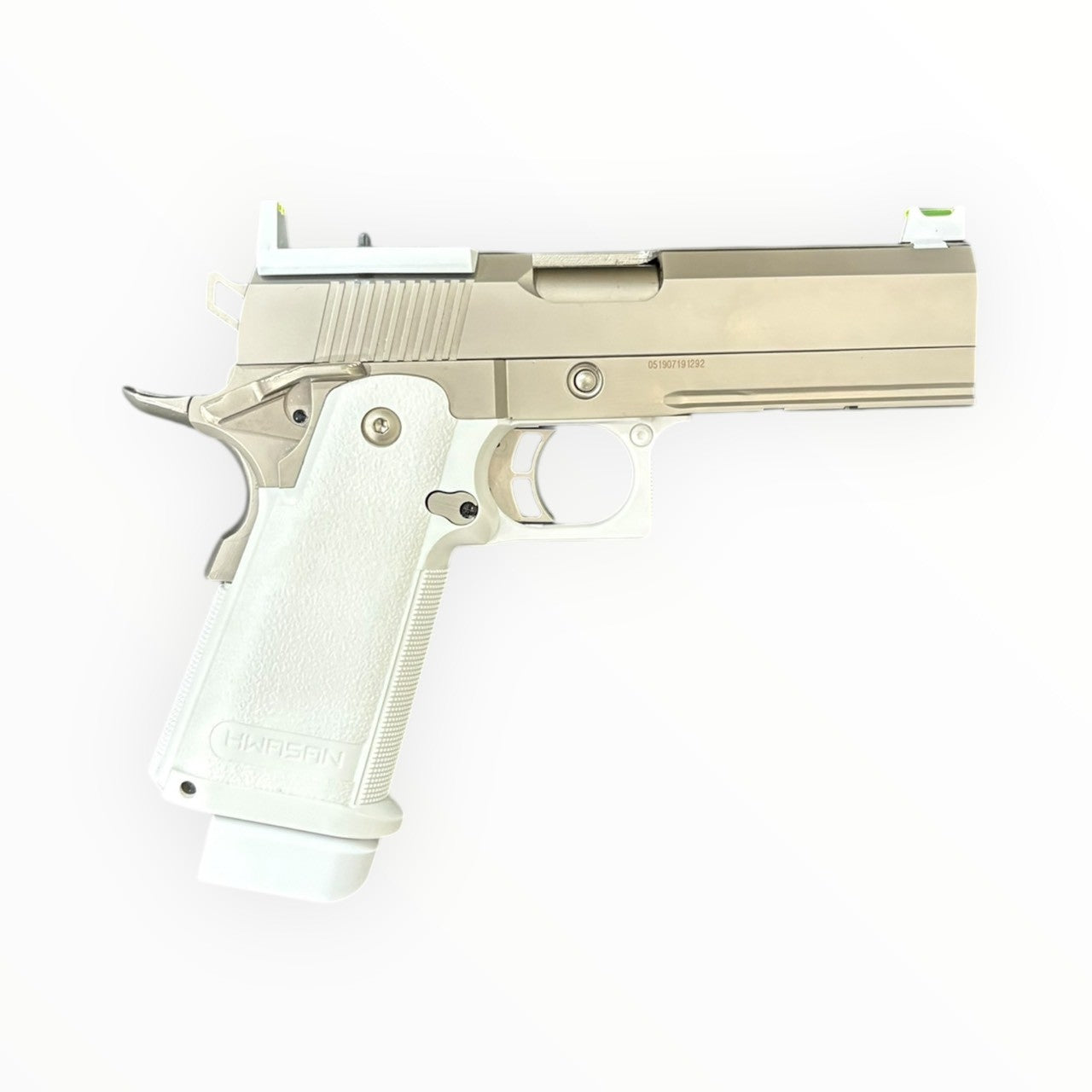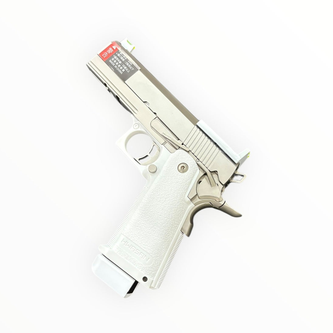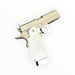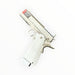 仿真 Hi-Capa 短槍,鋁合金滑套與霧銀拉絲外觀,支援 MOS 直裝 RMR 紅點。雙系統兼容瓦斯/CO₂ 彈匣,適用生存遊戲、訓練、道具或收藏。請遵守當地法規與場地規定。