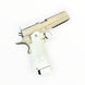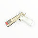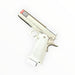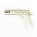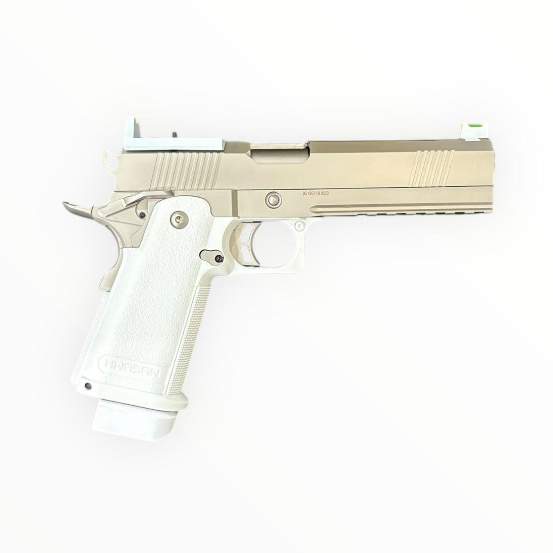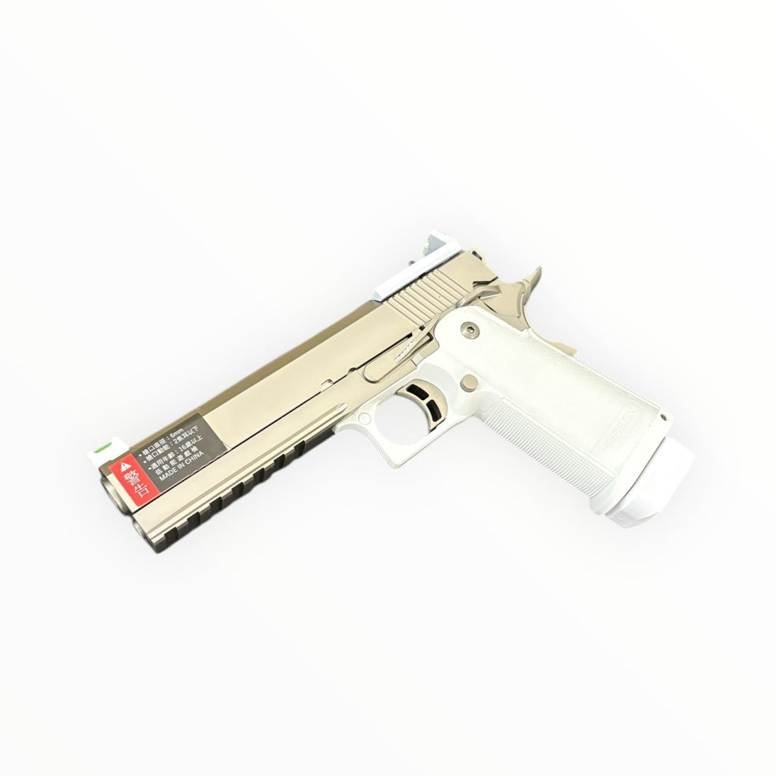 仿真 Hi-Capa 5.1 短槍,鋁合金滑套與霧銀拉絲外觀,支援 MOS 直裝 RMR 紅點。雙系統兼容瓦斯/CO₂ 彈匣,適用生存遊戲、訓練、道具或收藏。請遵守當地法規與場地規定。