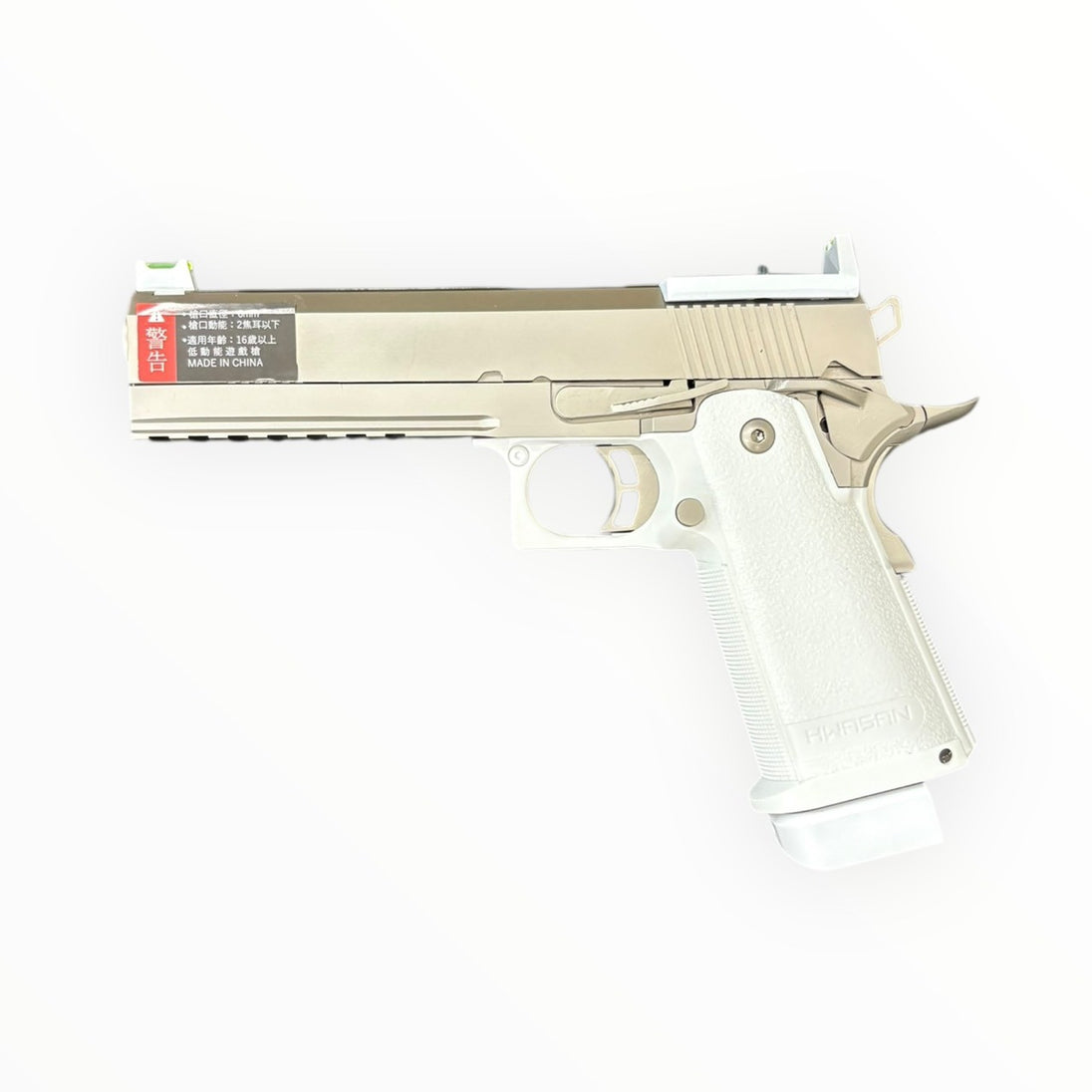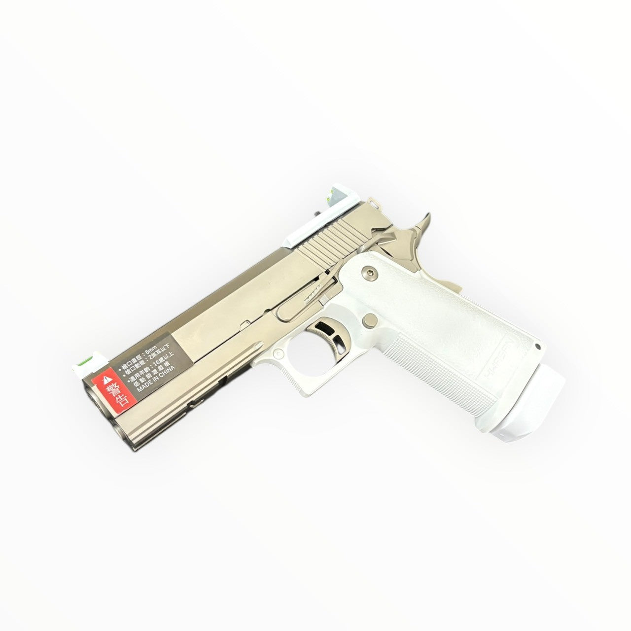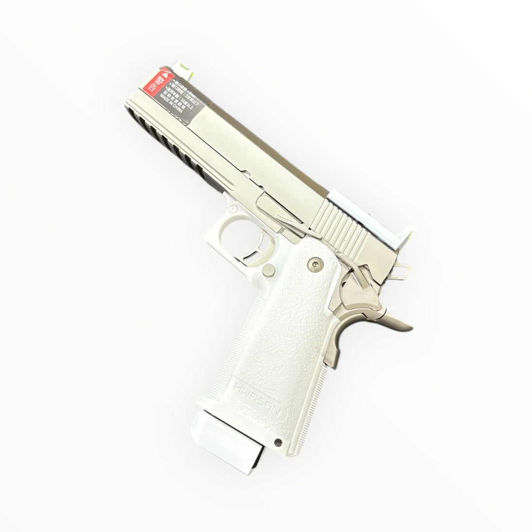 Realistic Hi-Capa 5.1 compact pistol with aluminum alloy slide and brushed silver finish. MOS-ready for direct RMR red-dot mounting. Dual-system compatible with gas or optional CO₂ mags — ideal for airsoft, training, props, or collecting. Always follow local laws and field rules.