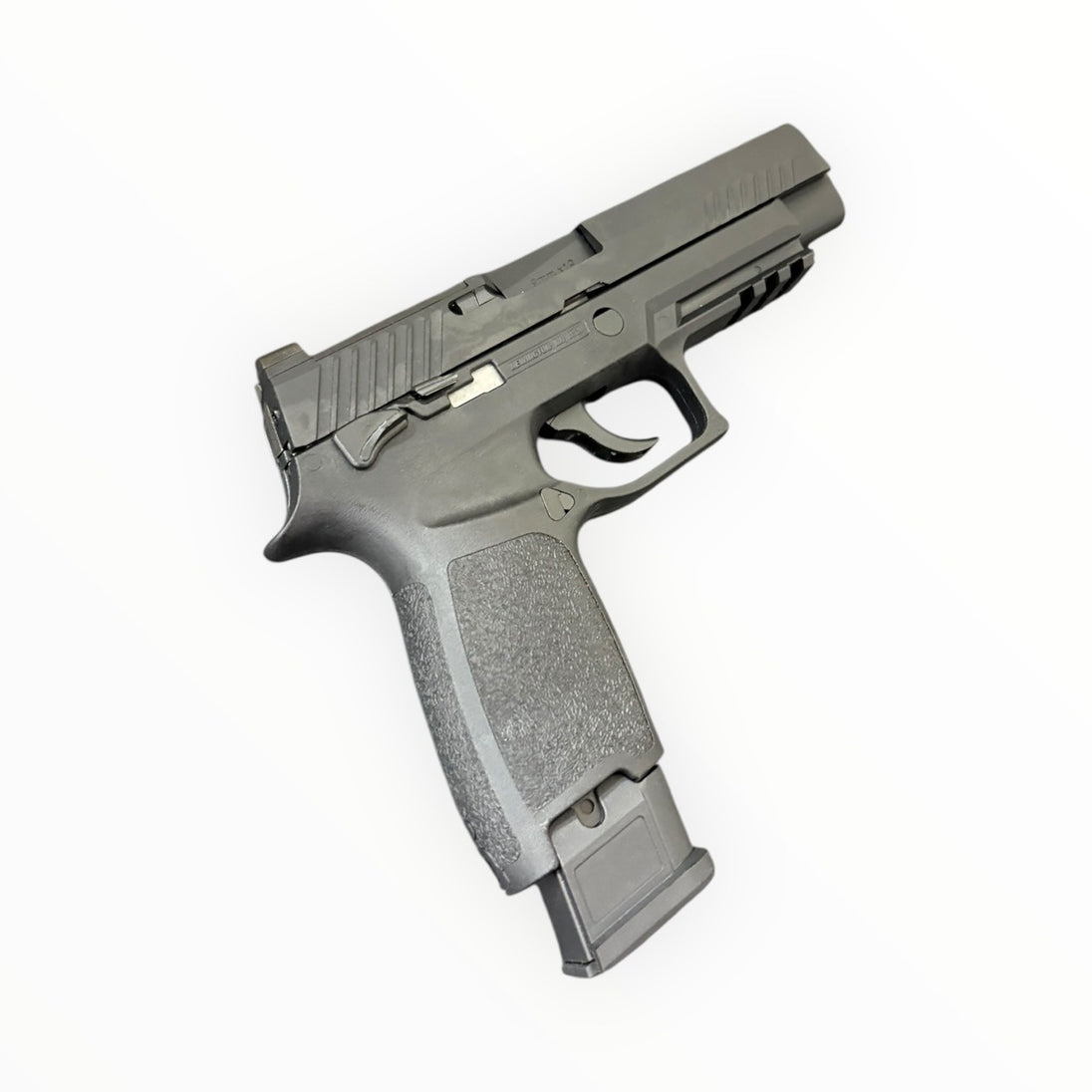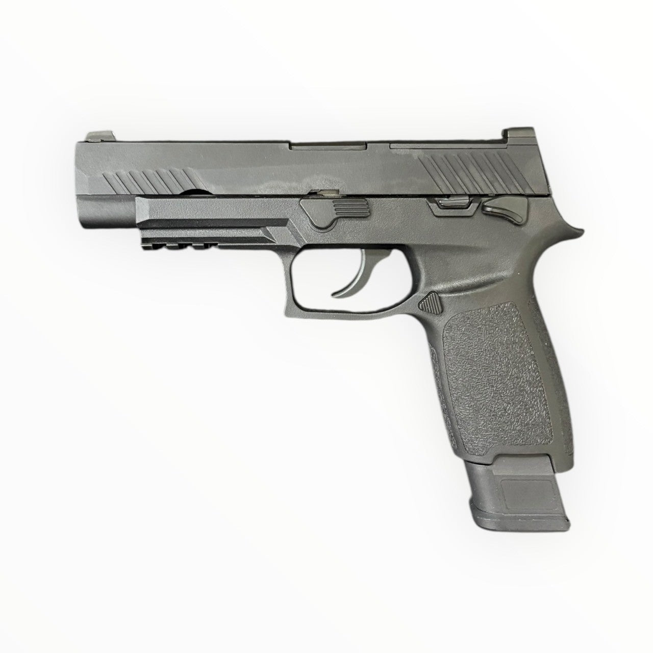 Metal slide and outer barrel with reinforced nylon-fiber frame and metal magazine (no bolt hold-open). Built-in RMR mount on slide for direct red-dot installation. Suitable for airsoft, training, props, or collecting. Always comply with local laws and field rules.